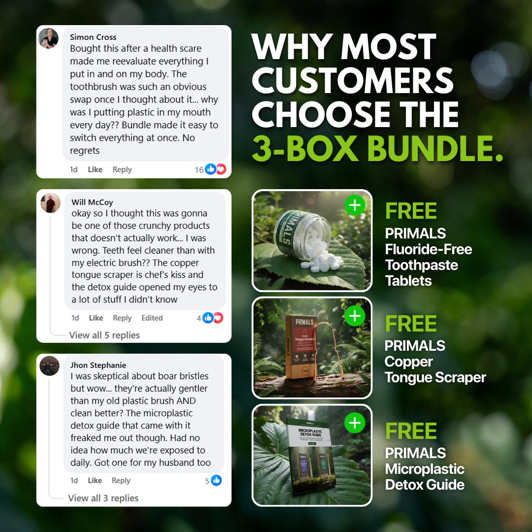 PRIMALS toothbrushes are crafted with a biodegradable bamboo handle and natural boar hair bristles - no plastic, no synthetics, and no toxic residue. They're completely free from BPA, phthalates, and microplastic shedding. Fully biodegradable and plastic-free from top to bottom, PRIMALS is made for those who care about what goes into their body - and what ends up in the environment.