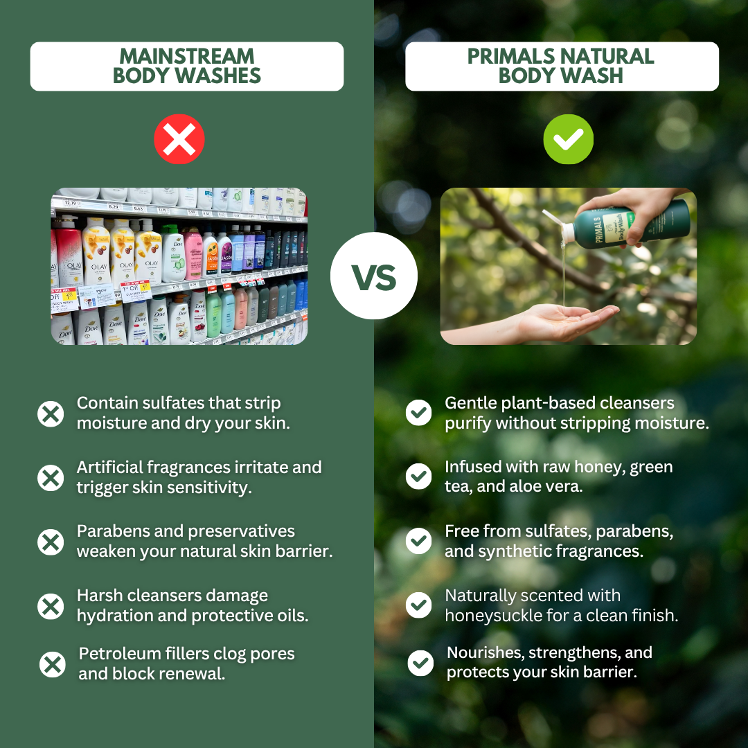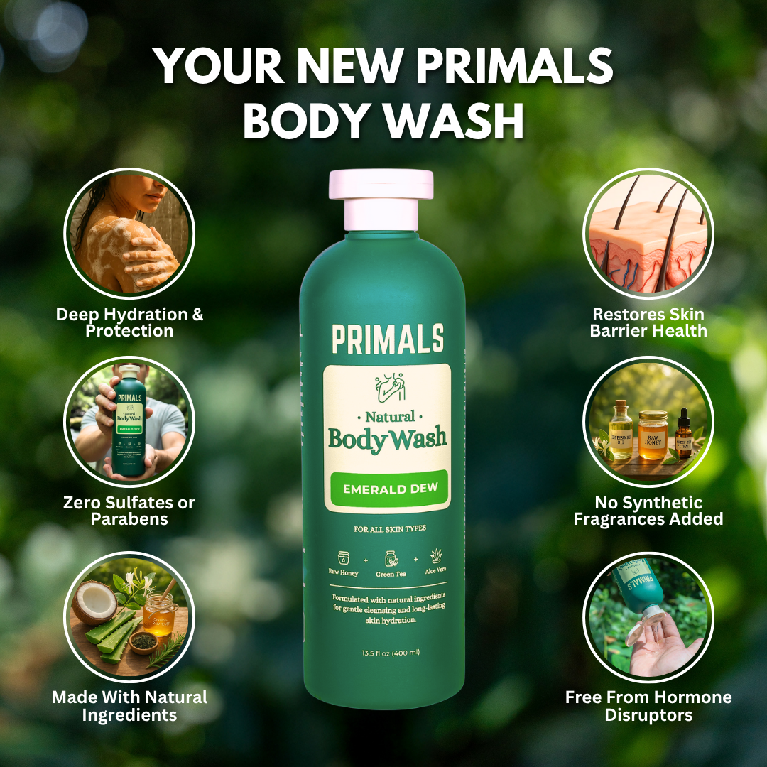PRIMALS Body Wash is made with raw honey, aloe vera, and green tea - not lab-made toxins. Free from sulfates, parabens, and synthetic fragrances, it restores hydration, strengthens the skin barrier, and protects your body from chemical overload. It’s the clean, hormone-safe upgrade your skin has been waiting for.