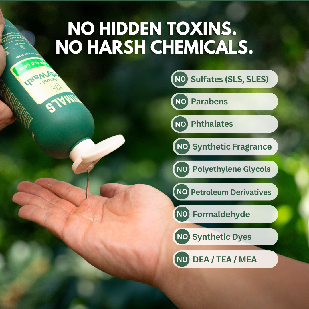 Most mainstream body washes use sulfates, parabens, phthalates, and synthetic fragrances – chemicals that make skin feel clean but actually strip and damage it over time.