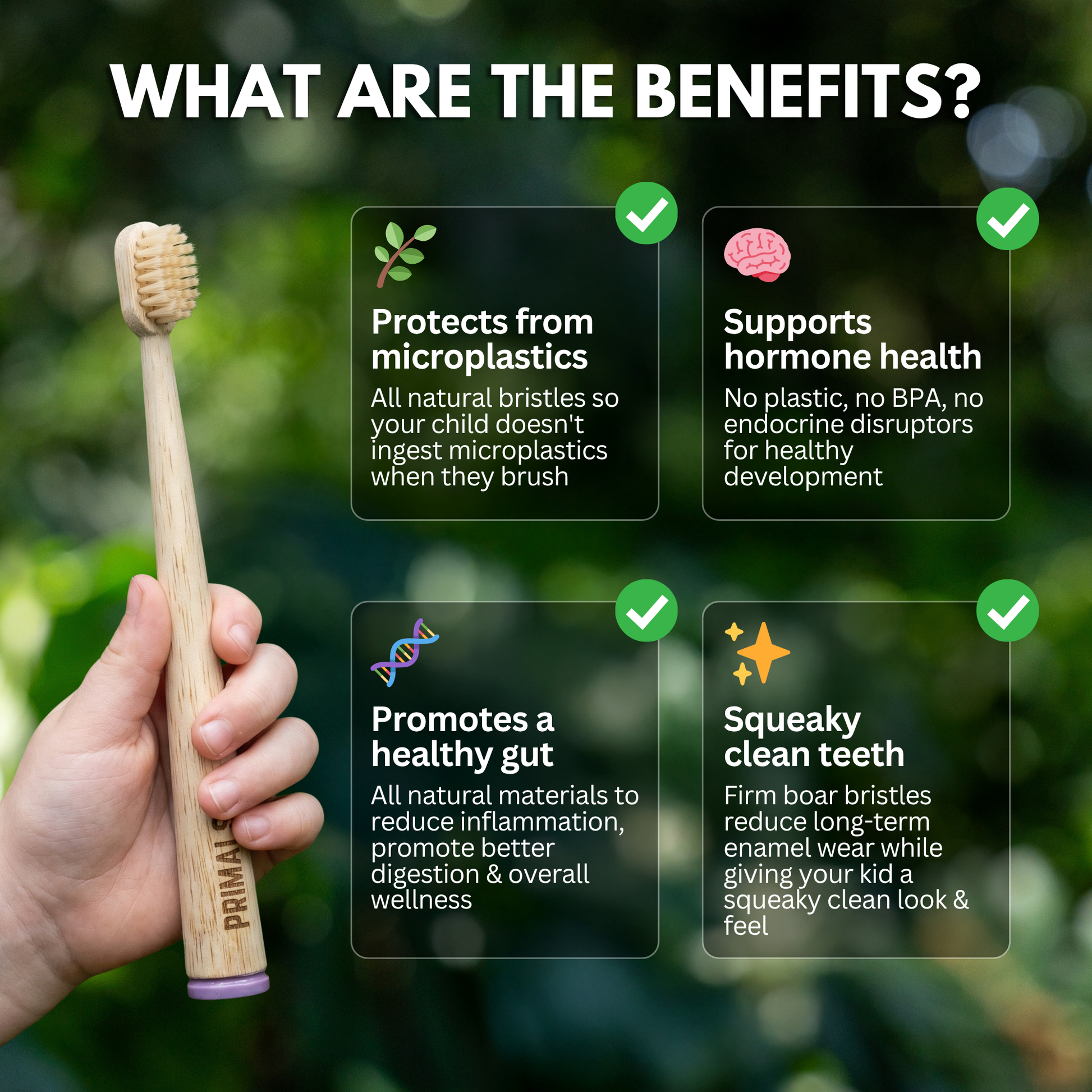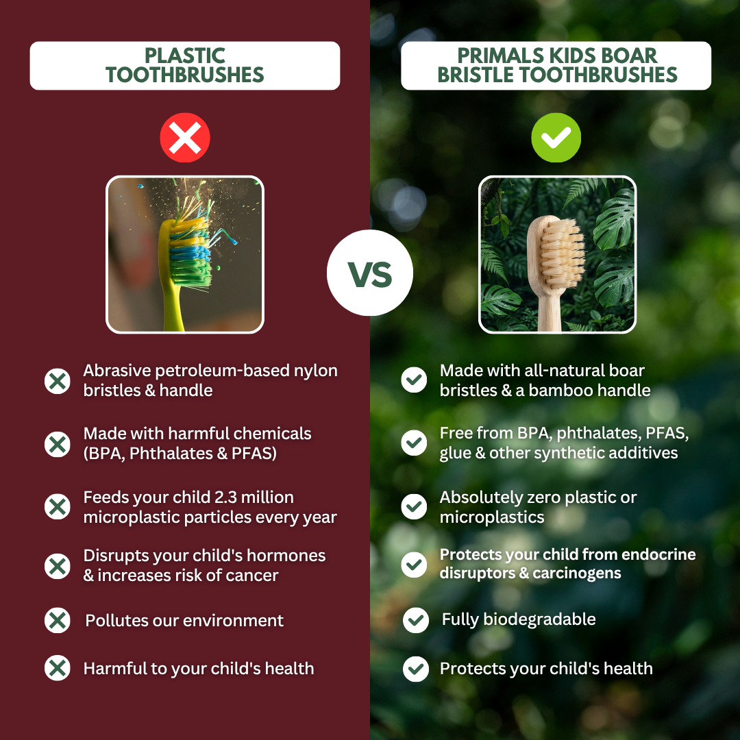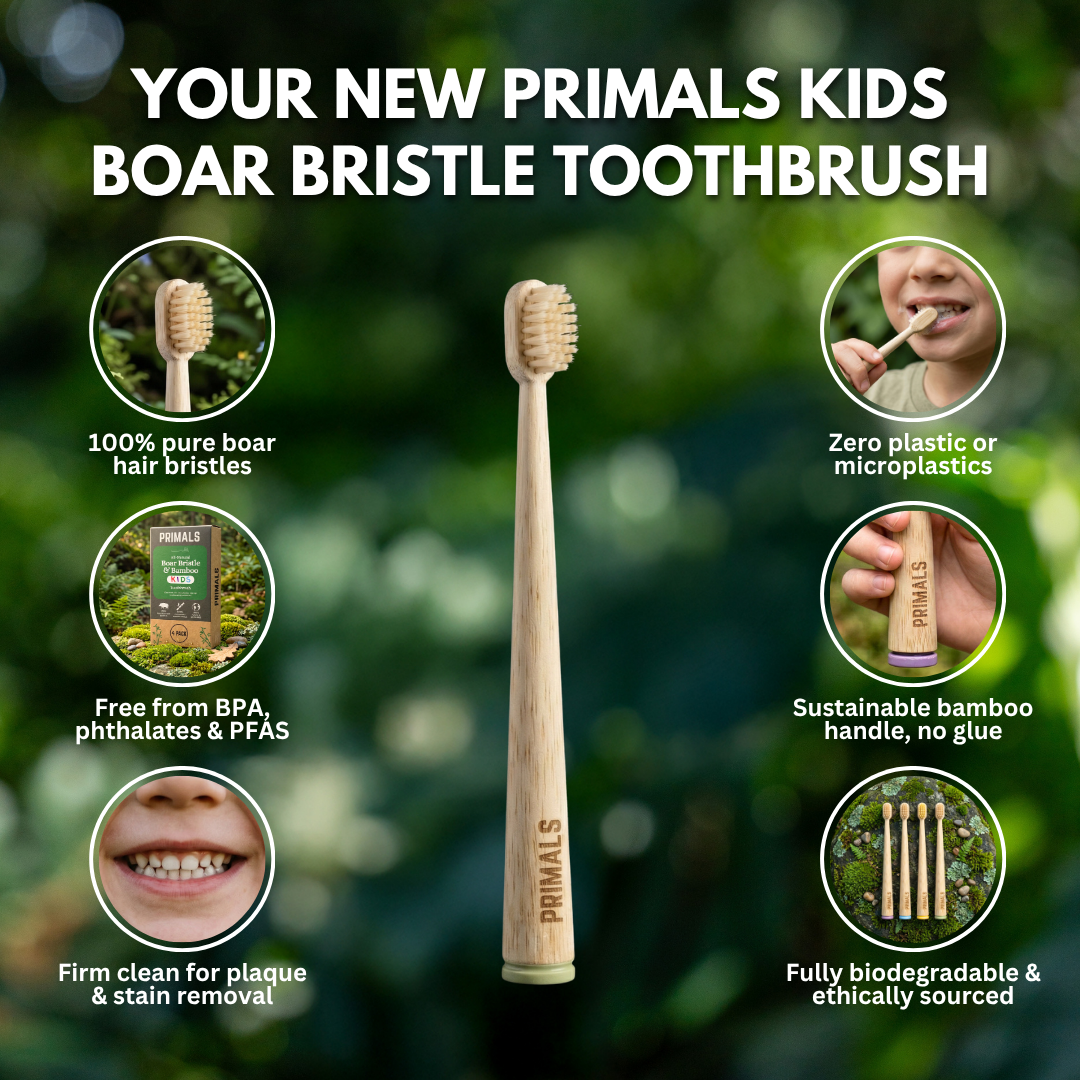RIMALS Kids toothbrushes are crafted with a biodegradable bamboo handle and natural boar hair bristles, no plastic, no synthetics, and no toxic residue. They're completely free from BPA, phthalates, and microplastic shedding. Fully biodegradable and plastic-free from top to bottom, PRIMALS is made for parents who care about what goes into their kid's body, and what ends up in the environment.