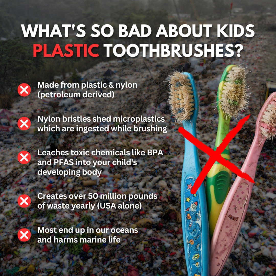 Plastic toothbrushes are made with nylon bristles and a plastic handle. Both plastic and nylon are derived from petroleum and contain BPA, phthalates, PFAS and many other carcinogenic and hormone disrupting compounds. As your child brushes their teeth with these nylon bristles, microplastic fragments are broken off, absorbed, and swallowed.